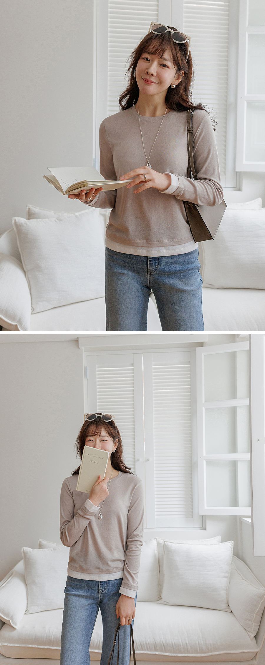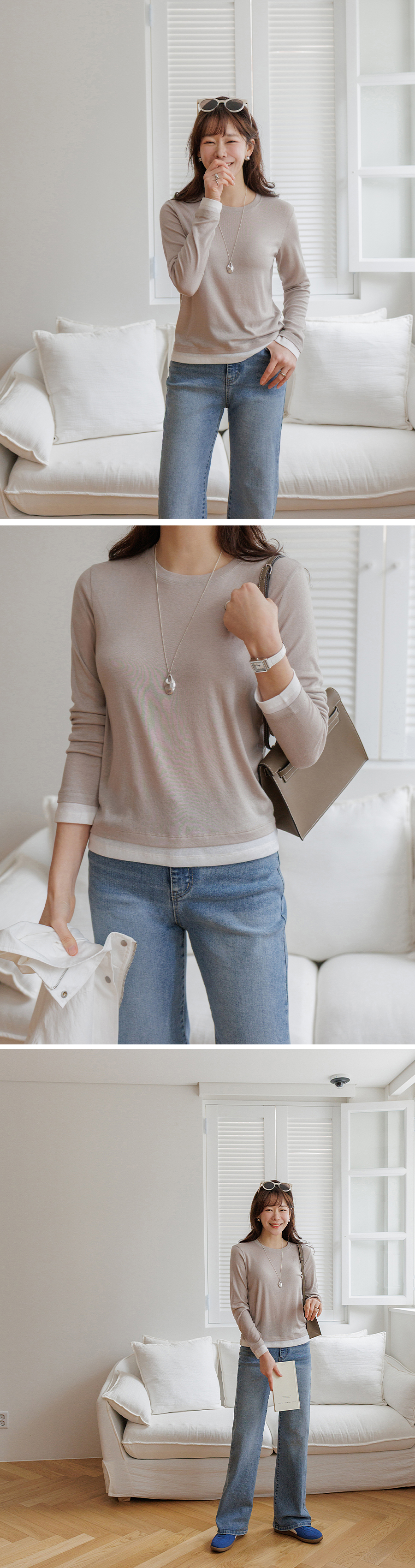 단정한 무드의 깔끔한 라운드 네크라인