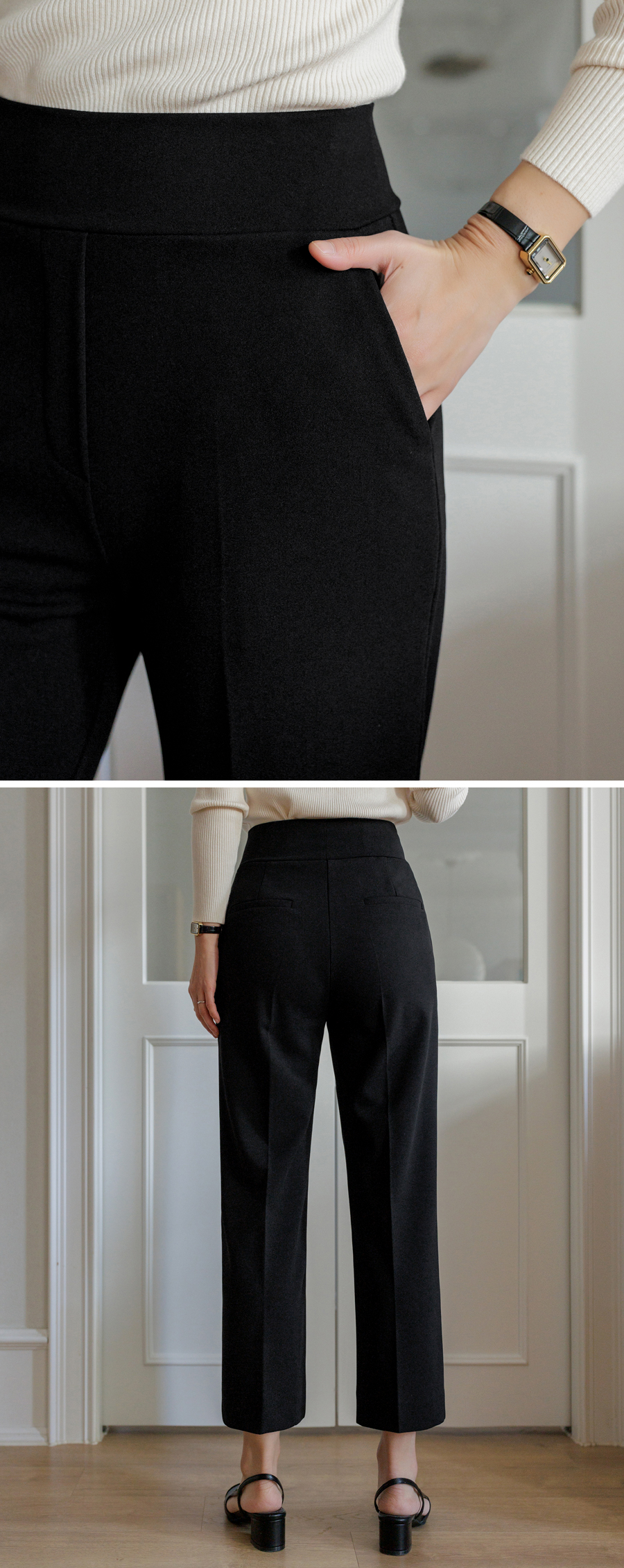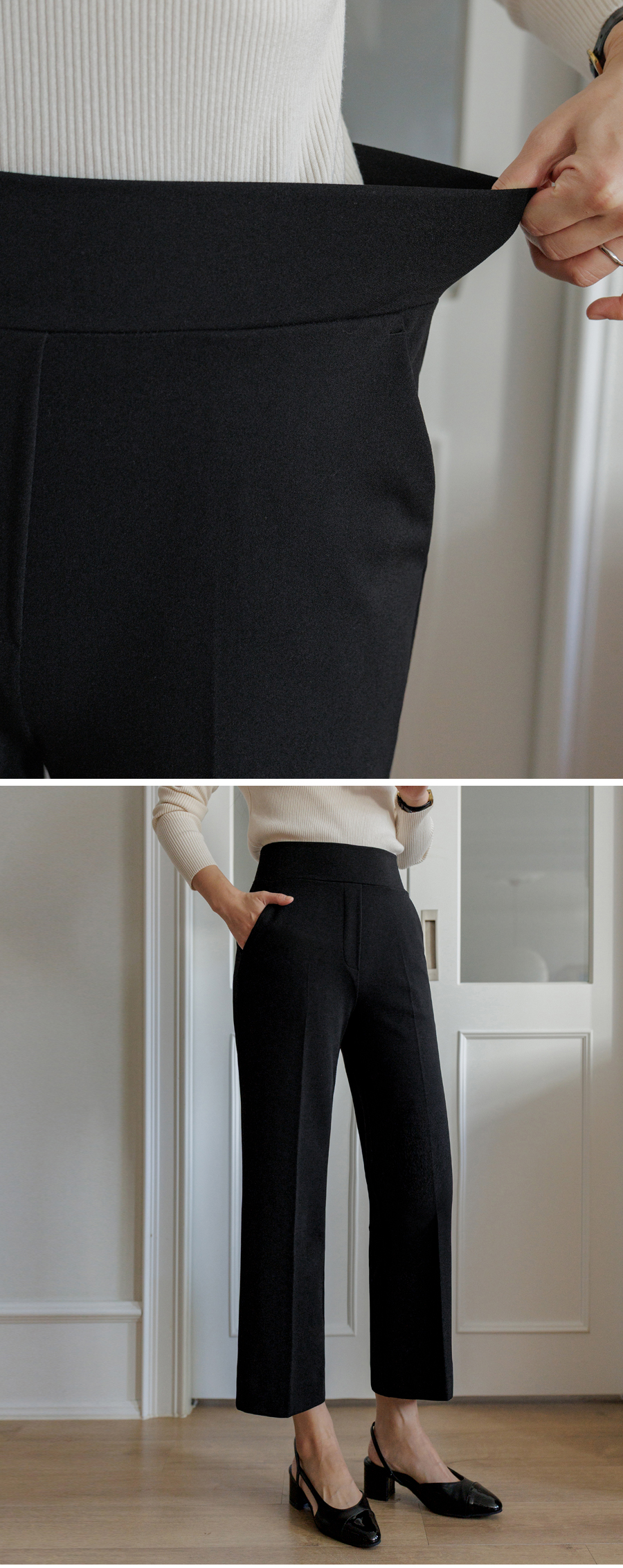 밴딩이 보이지 않도록 돌려감아 심플한 허리 쉐잎