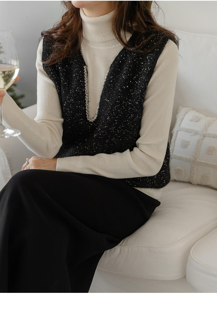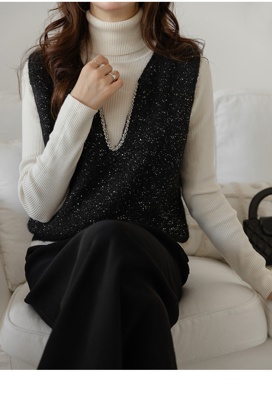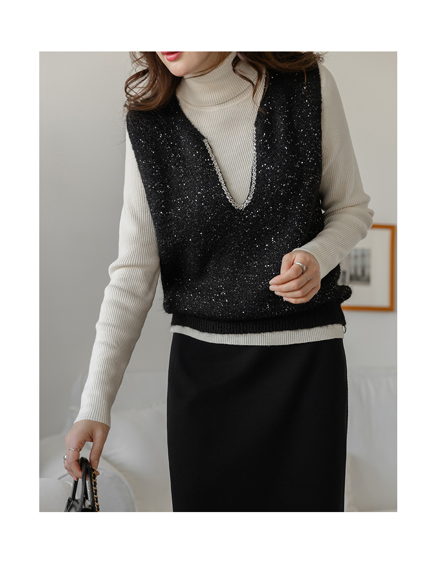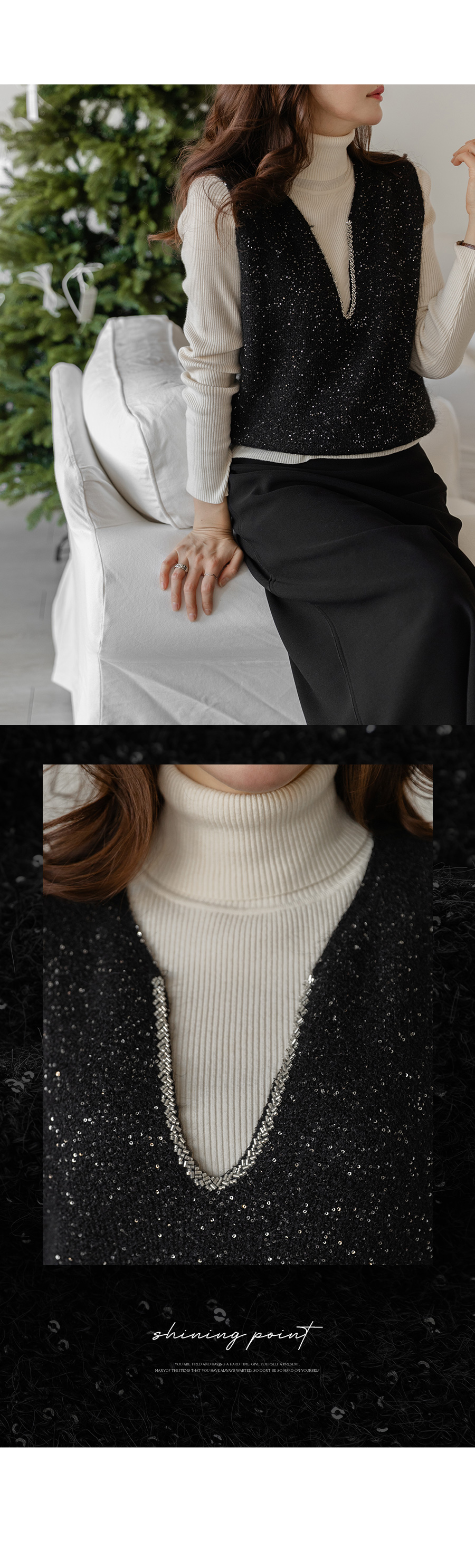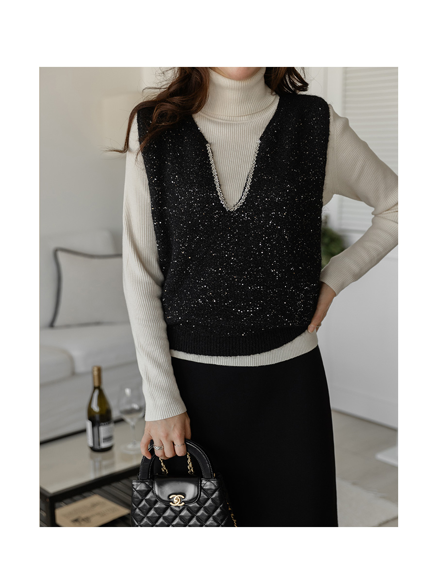 Knit Vest with sparkly sequins and glitter yarn. The neckline is cubic, adding a touch of luxury to the look! (3 colors)