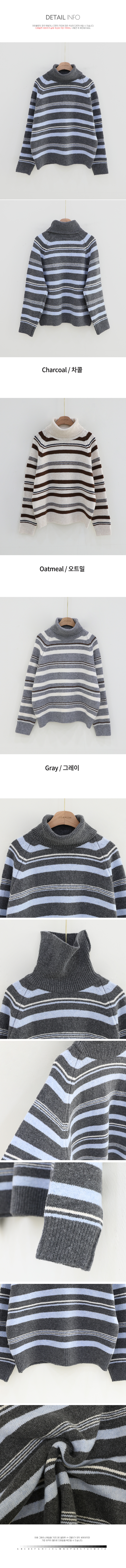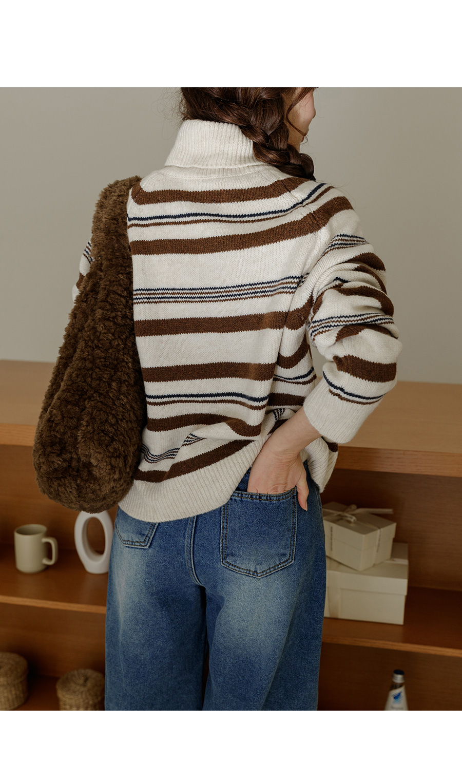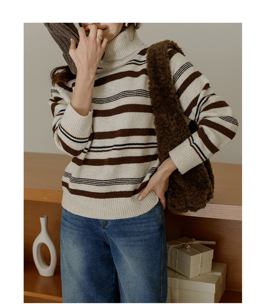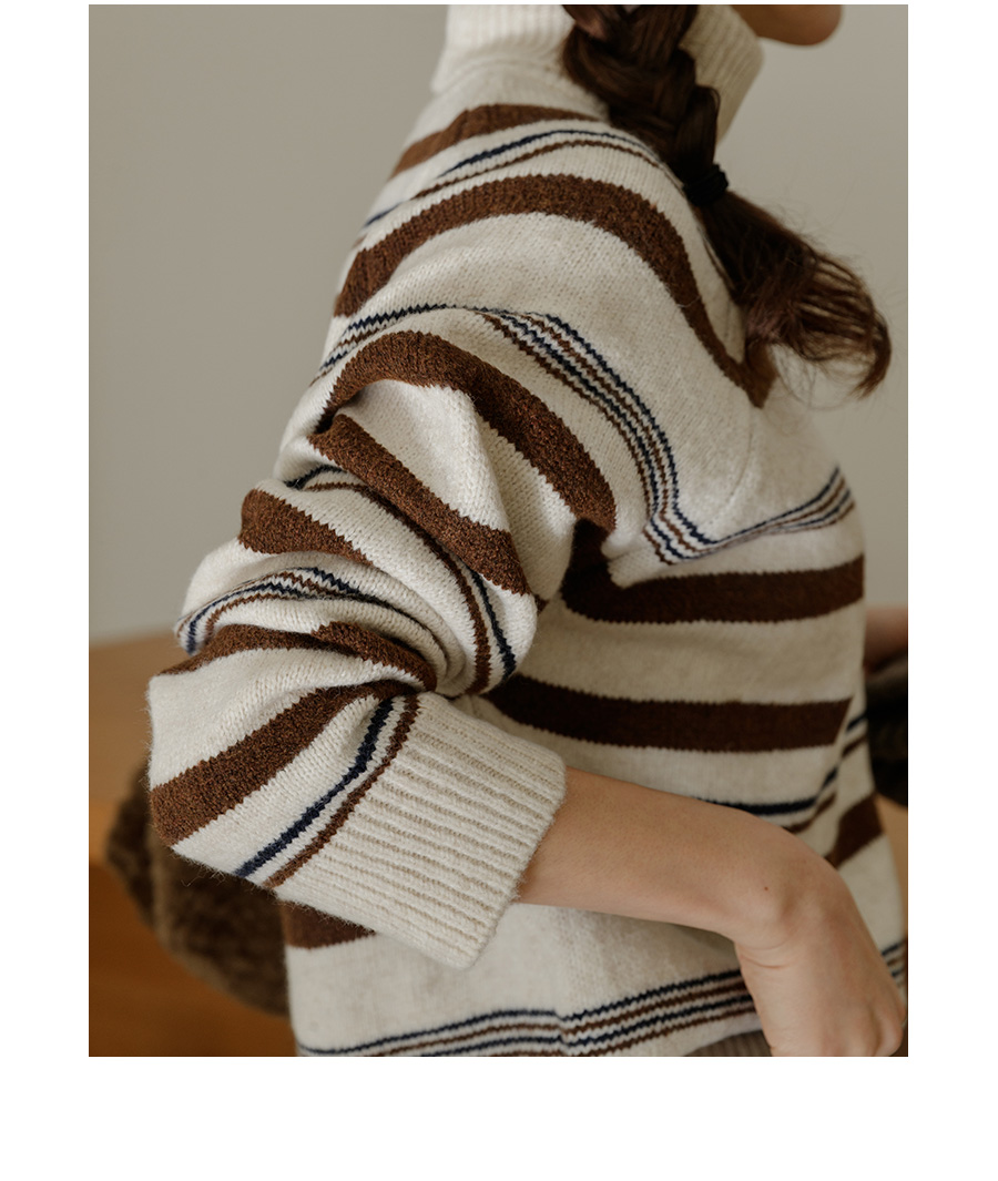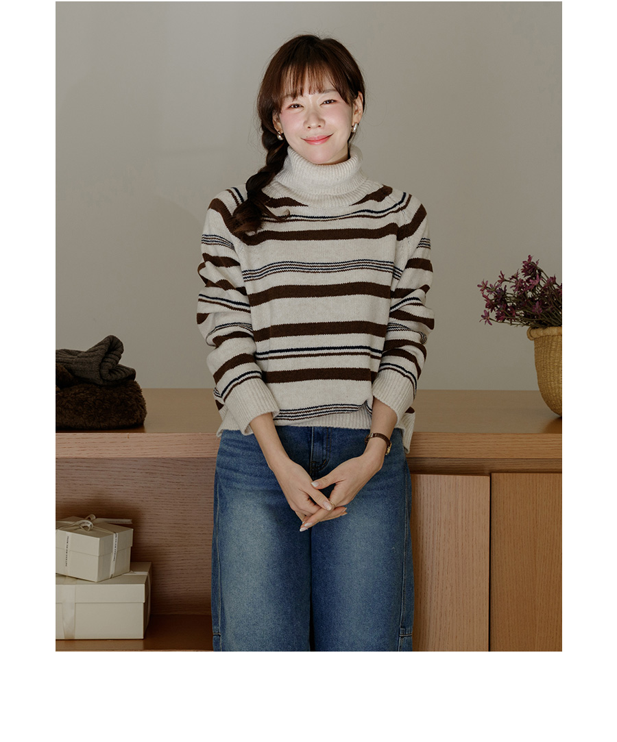 A turtleneck sweater with delicately colored stripes that provides warmth without being stuffy! (3 colors)