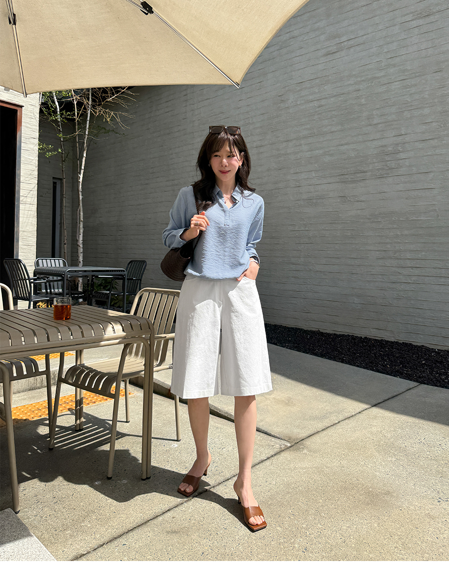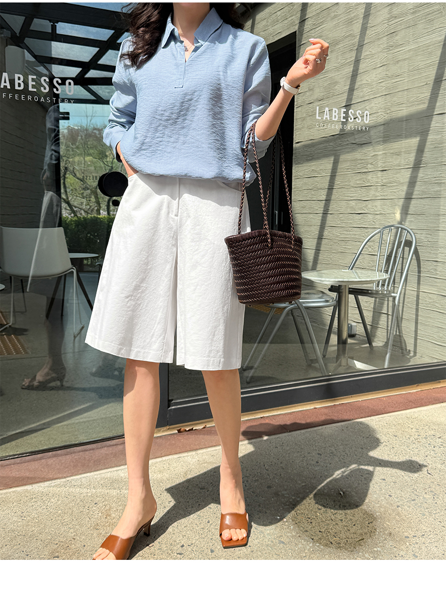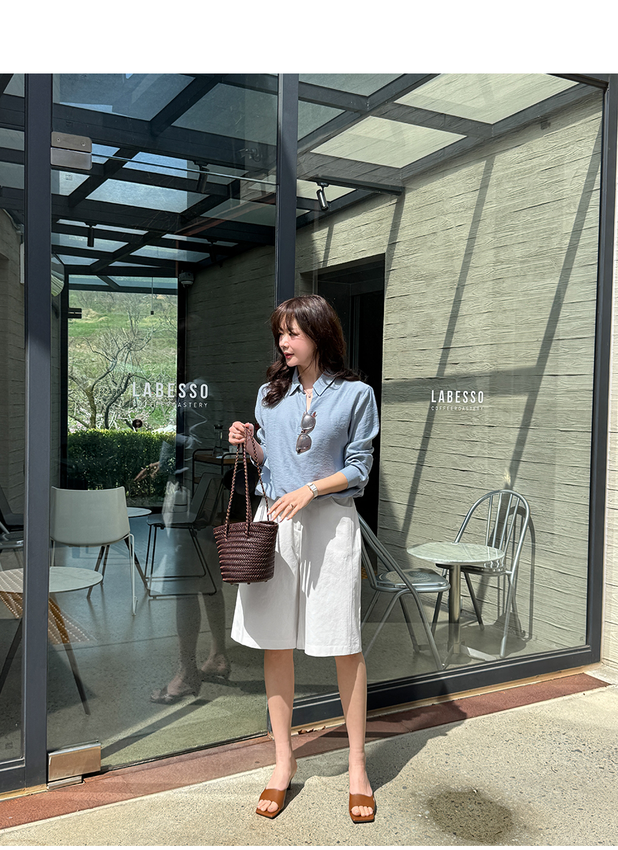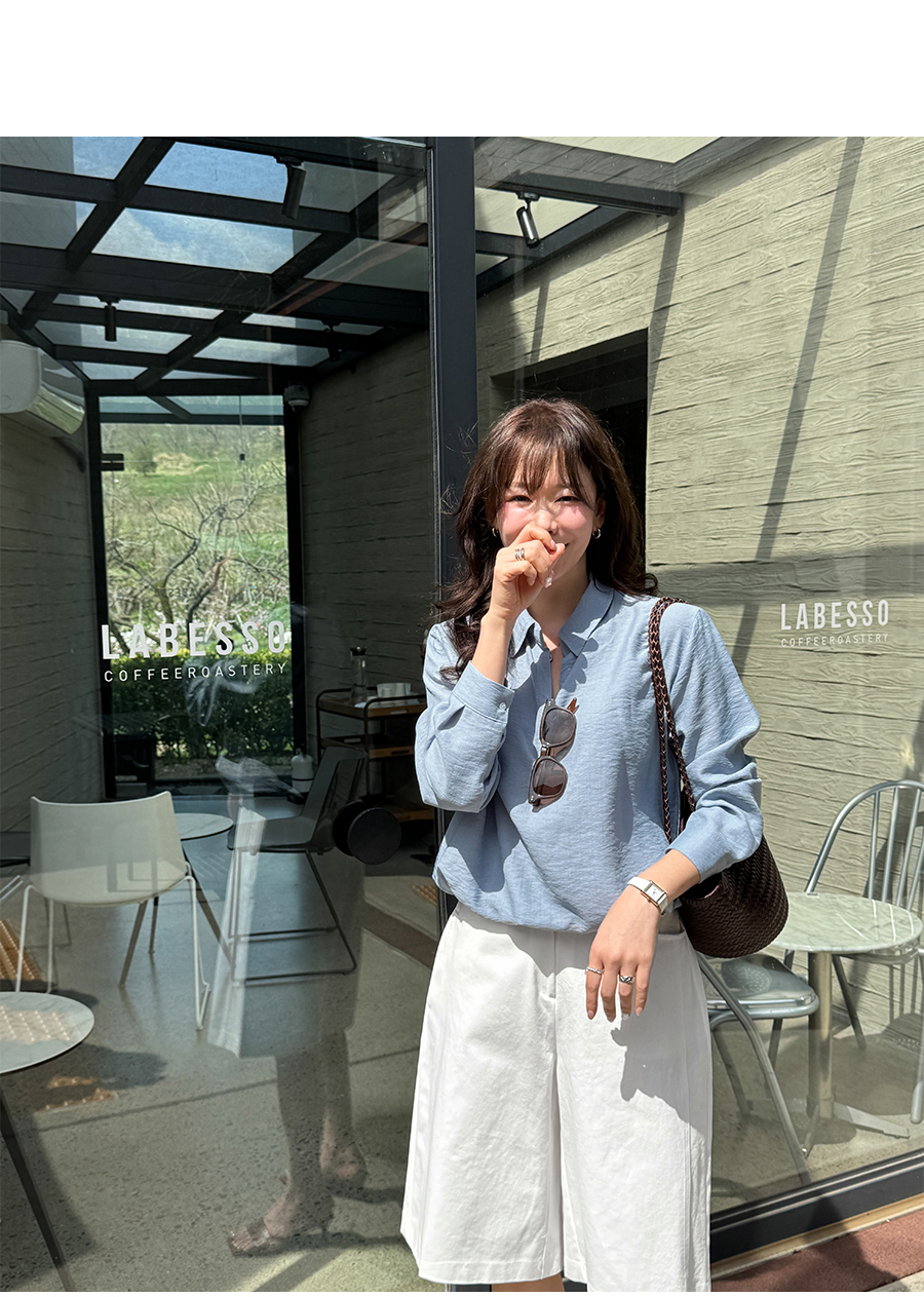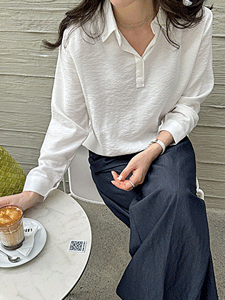 • Sheer fabric with natural crinkle finish! A neat half-open collar design for a clean and chic mood (5 colors)